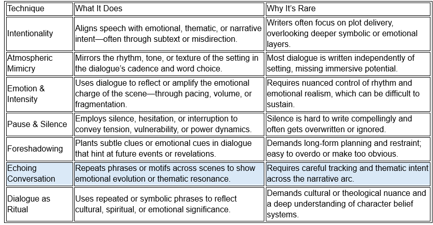 Let’s explore how to use echoing conversation to deepen character arcs, build tension, and create emotional resonance. You’ll learn how to plant phrases that return with weight, how to let setting alter tone, and how to craft dialogue that lingers—like a memory half-heard in the wind.