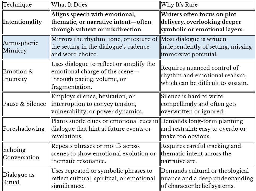 In part two of this seven-part series, we’ll explore how atmospheric mimicry transforms dialogue from mere exchange into emotional choreography—where every word moves in step with the scene’s mood, making speech feel inevitable, embodied, and alive.